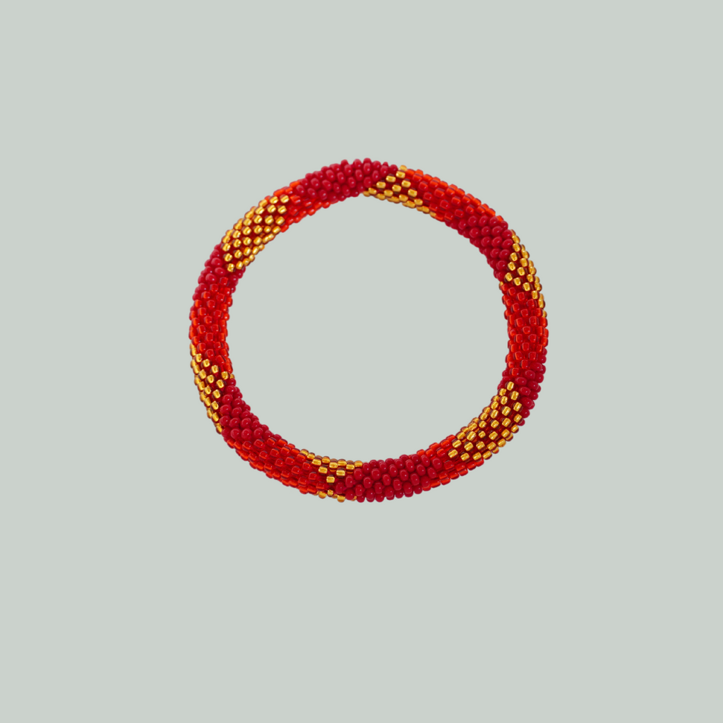 ROLL-ON PERLEARMBÅND FRA NEPAL - Blank rød med gyldne og røde perler