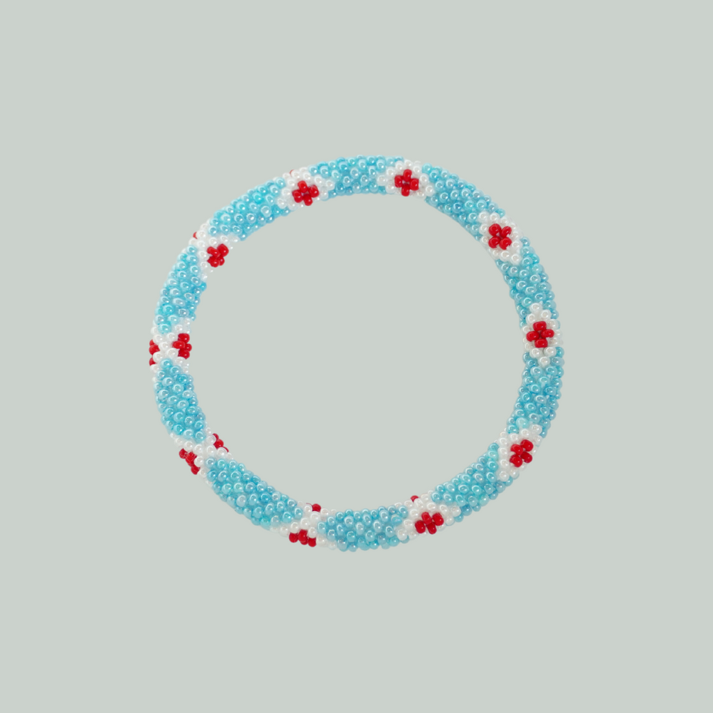 ROLL-ON PERLEARMBÅND FRA NEPAL - LYS BLÅ MED RØD OG HVID DETALJE